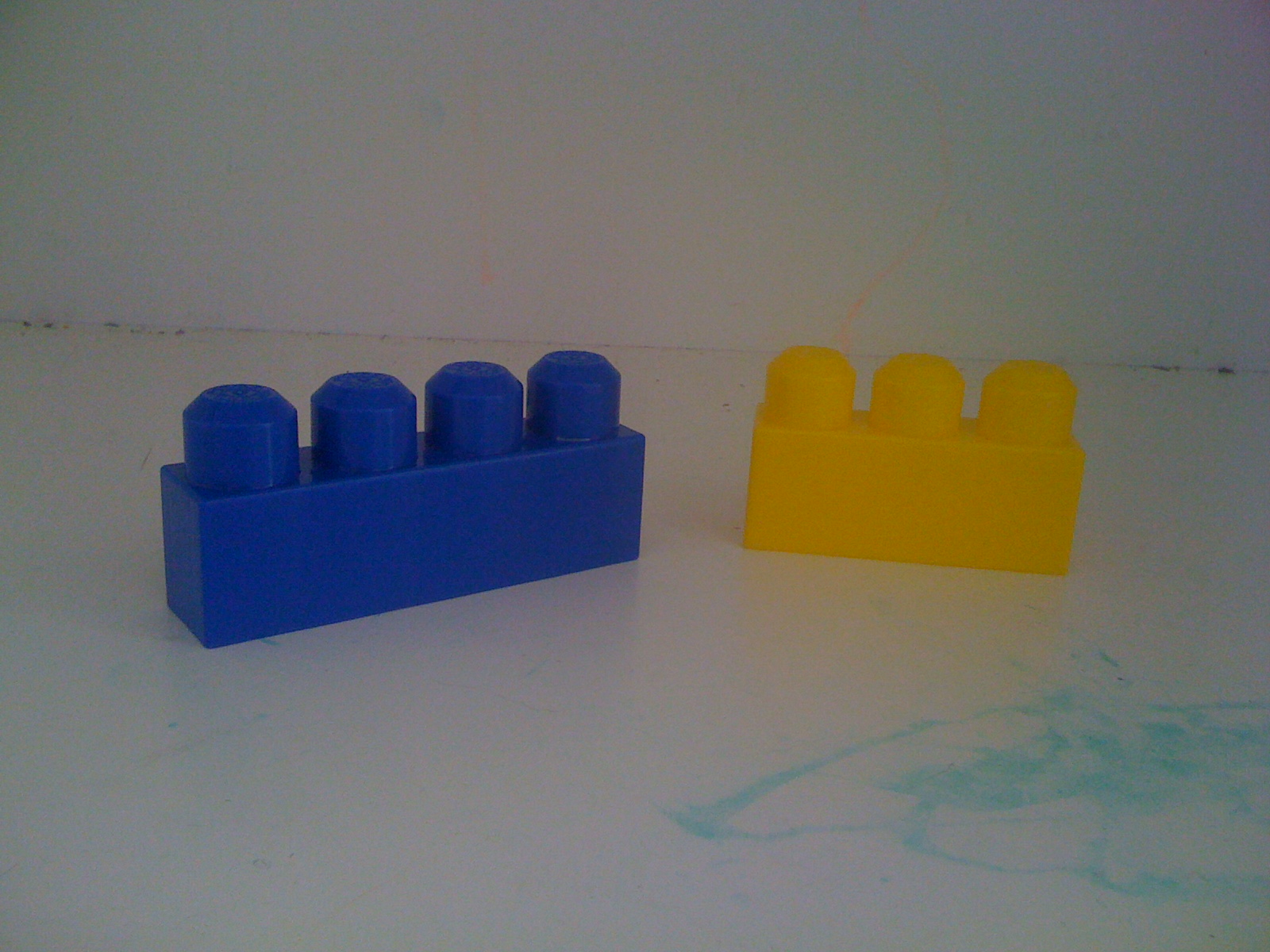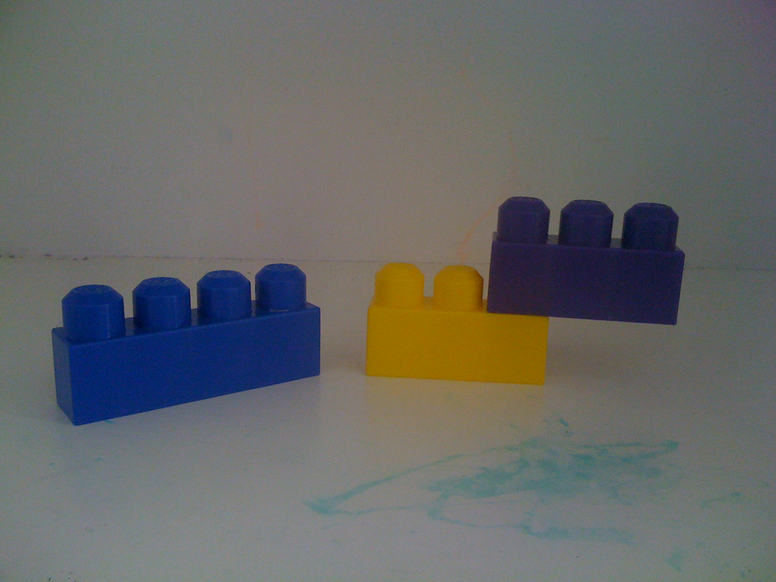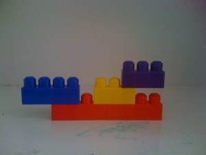 Next, I added a purple piece to the ensemble. This was the secondary character. I was really getting into the Lego-as-symbol thing at this stage, so I stuck this piece on top of the original yellow piece, but only partially, to show that the secondary character is only loosely connected to the main character at this point.