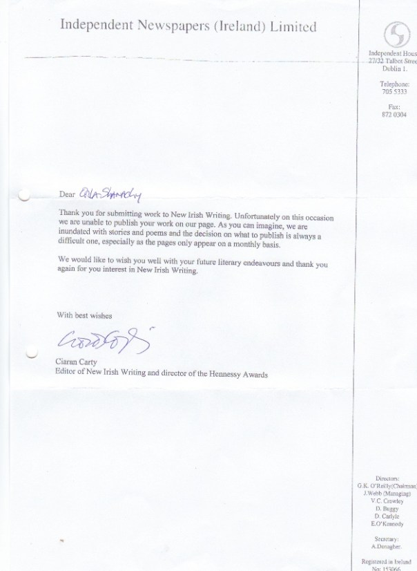 I recently received the following rejection letter from Ciaran Carty, editor of New Irish Writing, which appears monthly in the Irish Independent and has launched the careers of many prominent Irish writers, including Joseph O’ Connor, Dermot Bolger, Vona Groarke and Mary O’Malley.