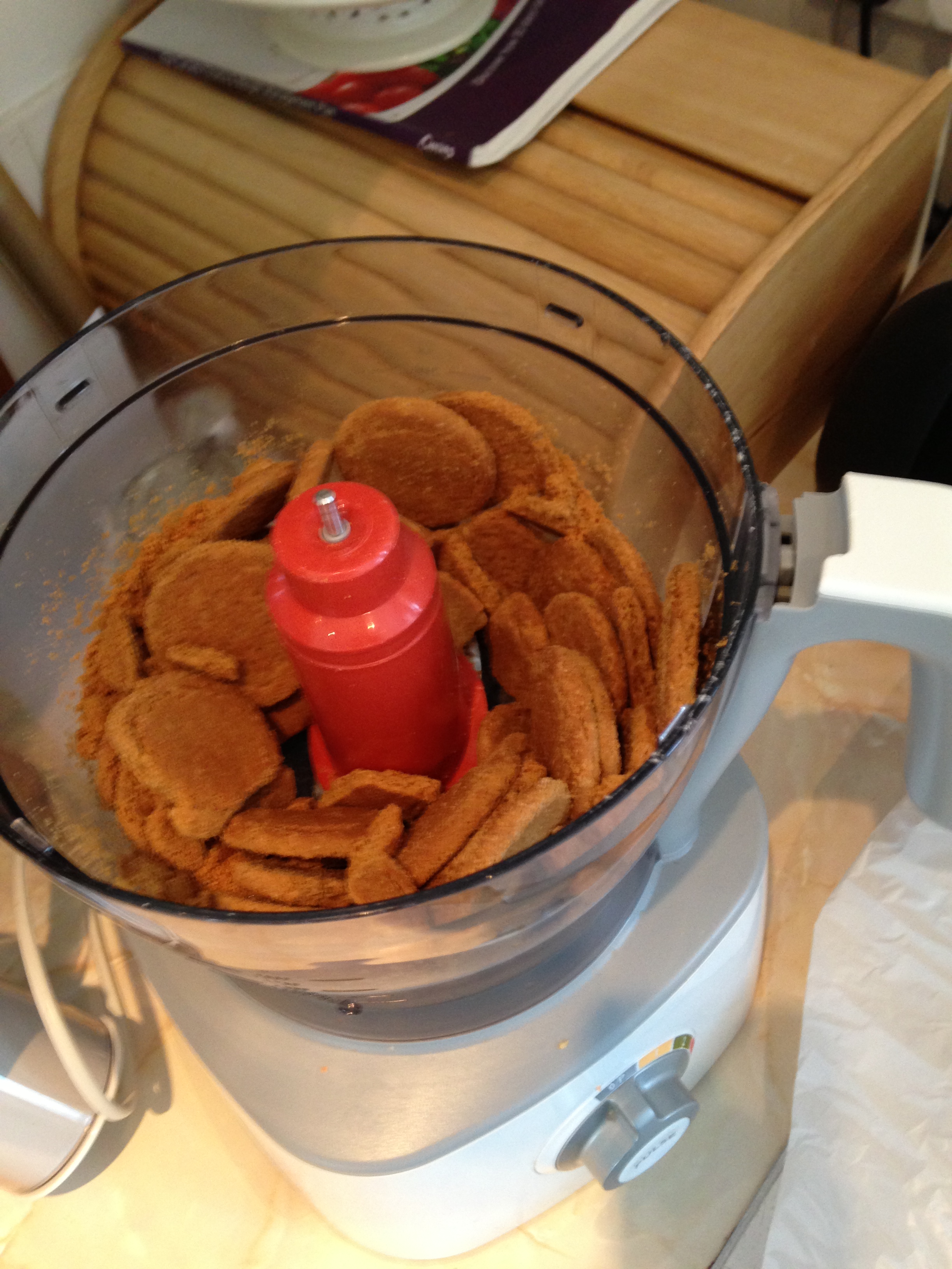 Another challenge at the preparation stage: how to crush the ginger biscuits? Being a lazy sort, I decided to get down the food processor from its position on high…