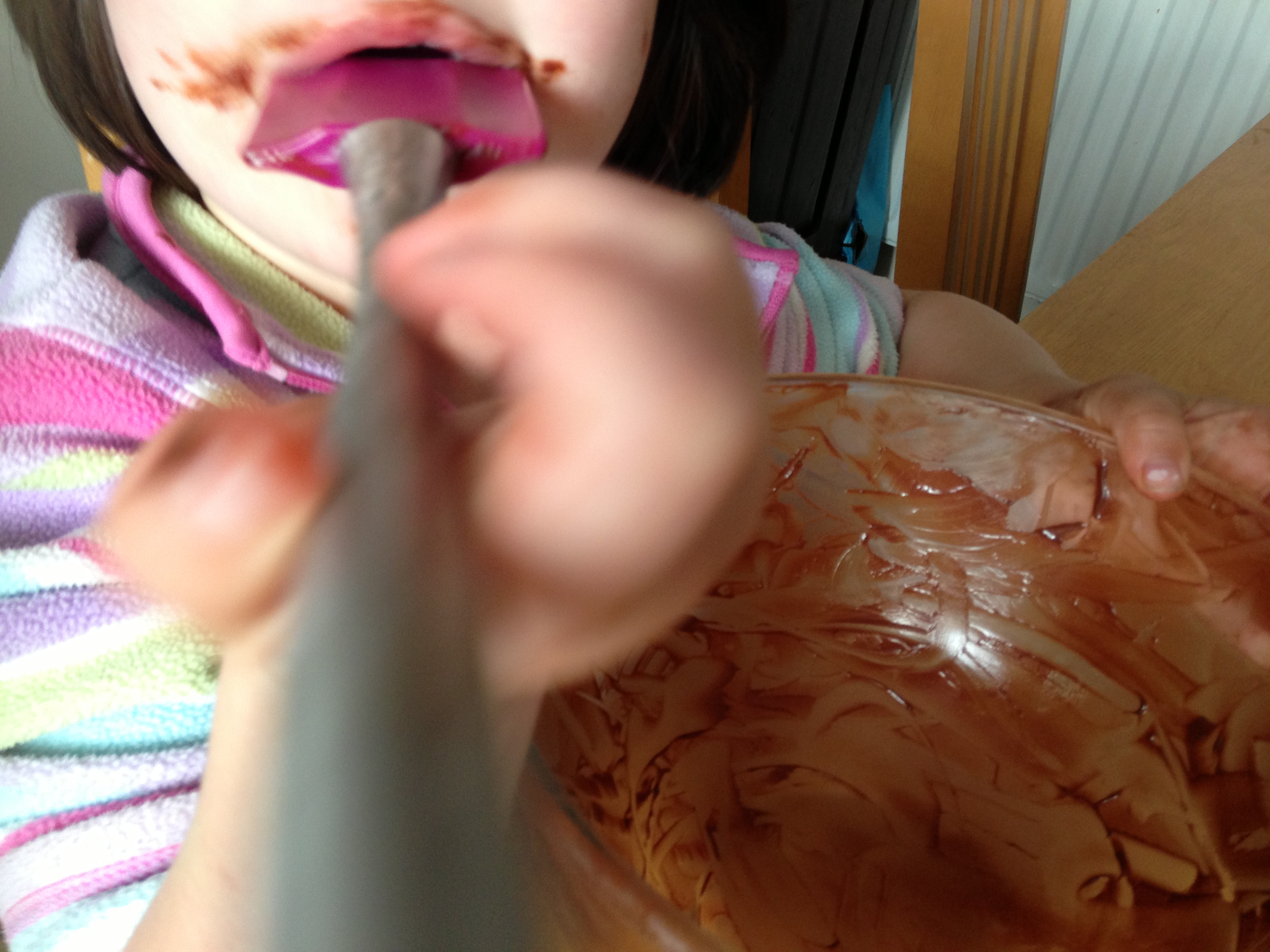 That’s your mixture done. Grab a nearby small child (ideally one of your own) and get them to help you to scrape the mixture into the baking tin (my last food post contains a quick-and-dirty method of lining a baking tin). The child can lick the bowl and utensils clean as a reward: