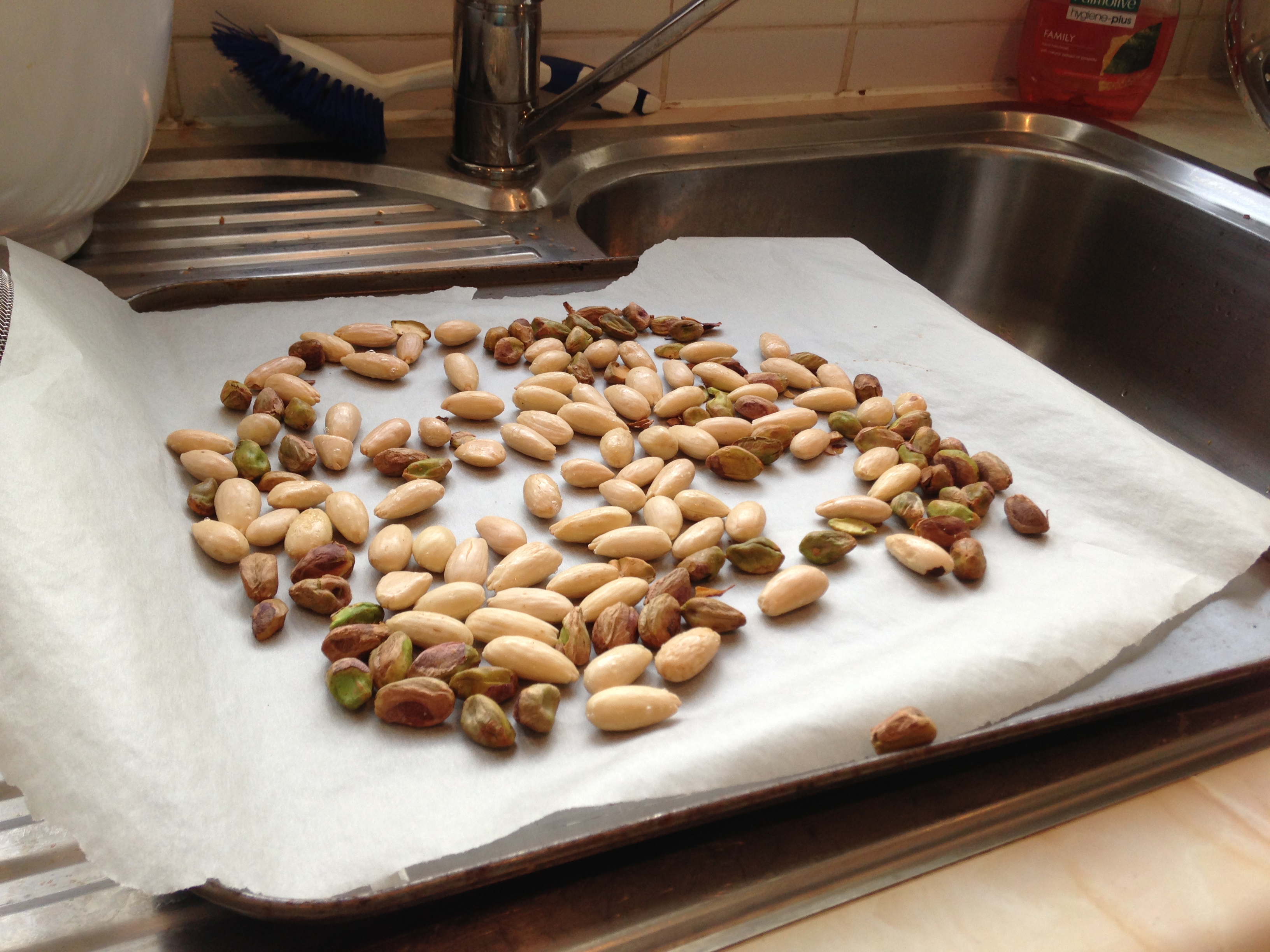 Next up was the roasting of the nuts, which takes only five minutes. But what a five minutes! The aroma of the pistachios as the heat of the oven draws out their oils is beyond words, so a picture will have to do: