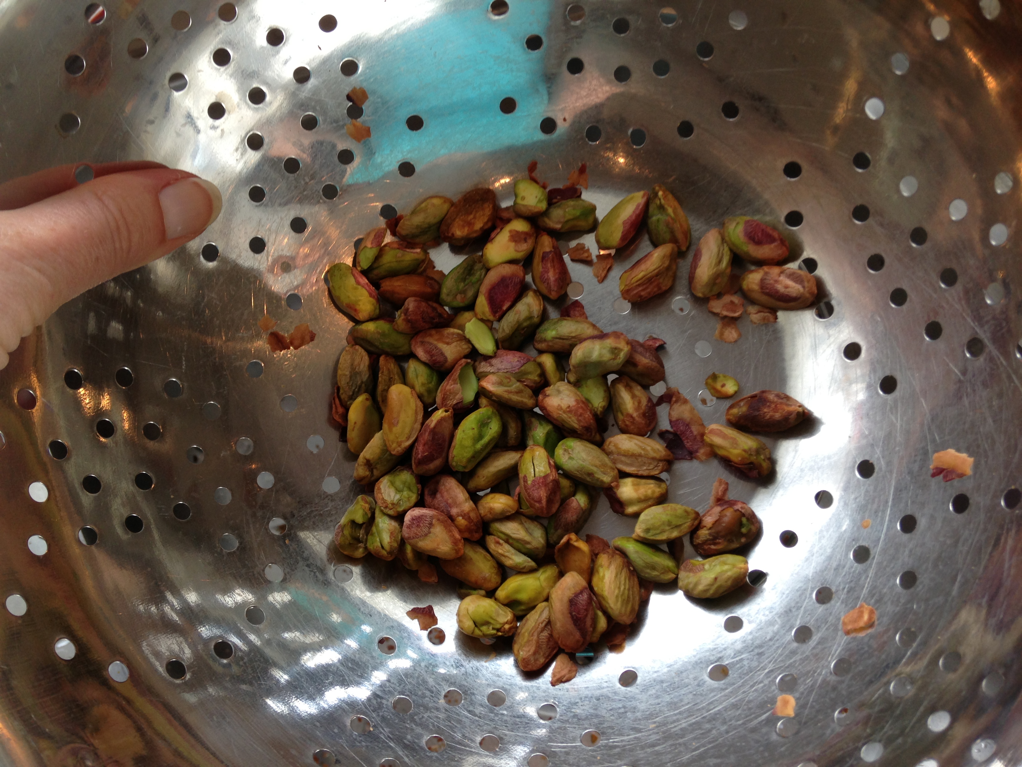 The next step called for a little “necessity is the mother of invention”. I didn’t know what to do about the skins on the pistachios, and I temporarily forgot about the existence of the internet. So first I swirled them around in a colander…