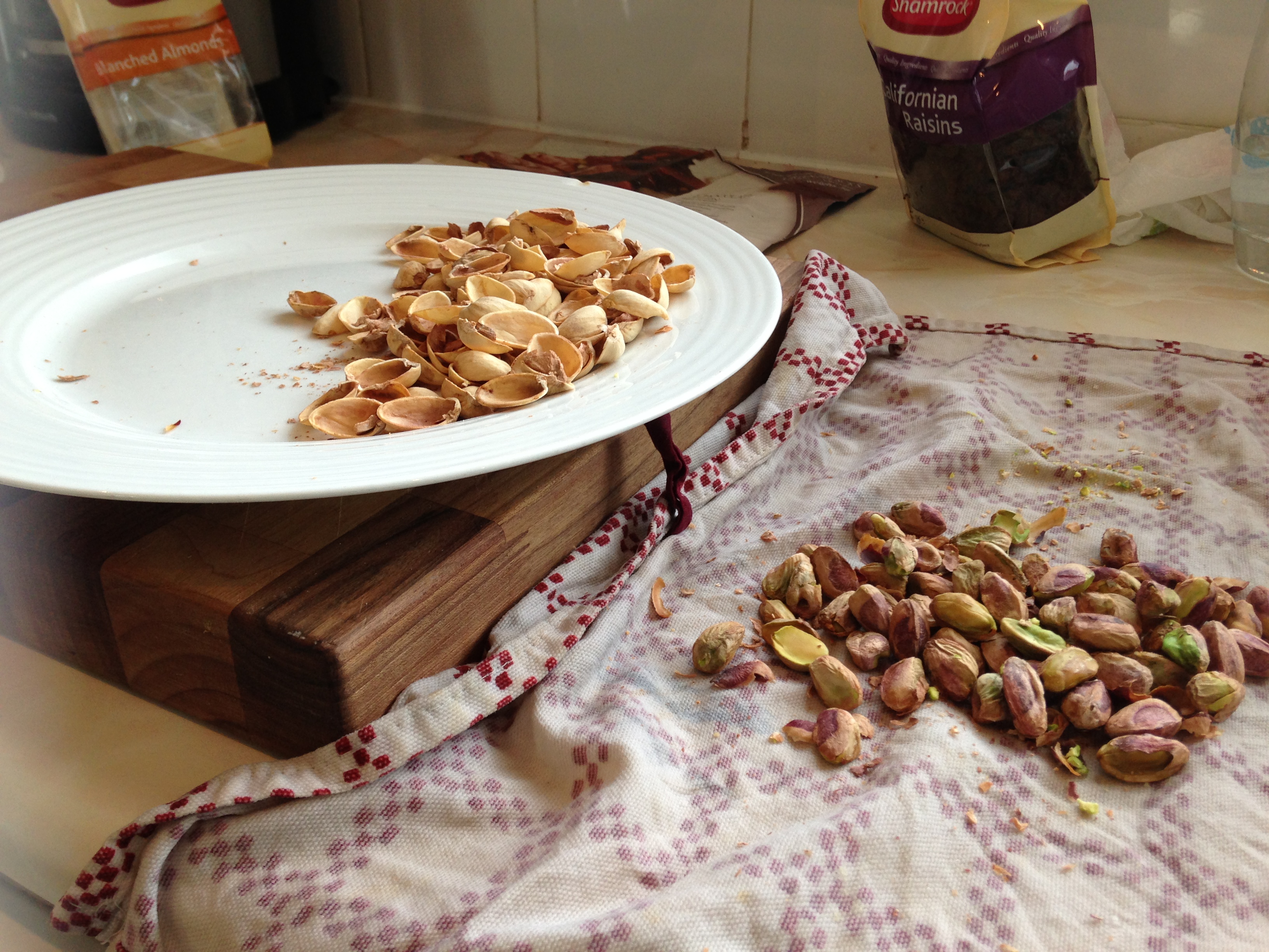 Next up are the nuts. This recipe calls for blanched whole almonds and pistachios. I couldn’t get pistachios pre-blanched, so I had to do it myself. Some of those babies are stubborn to prise open – cue a little swearing …